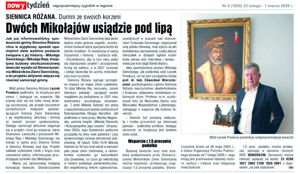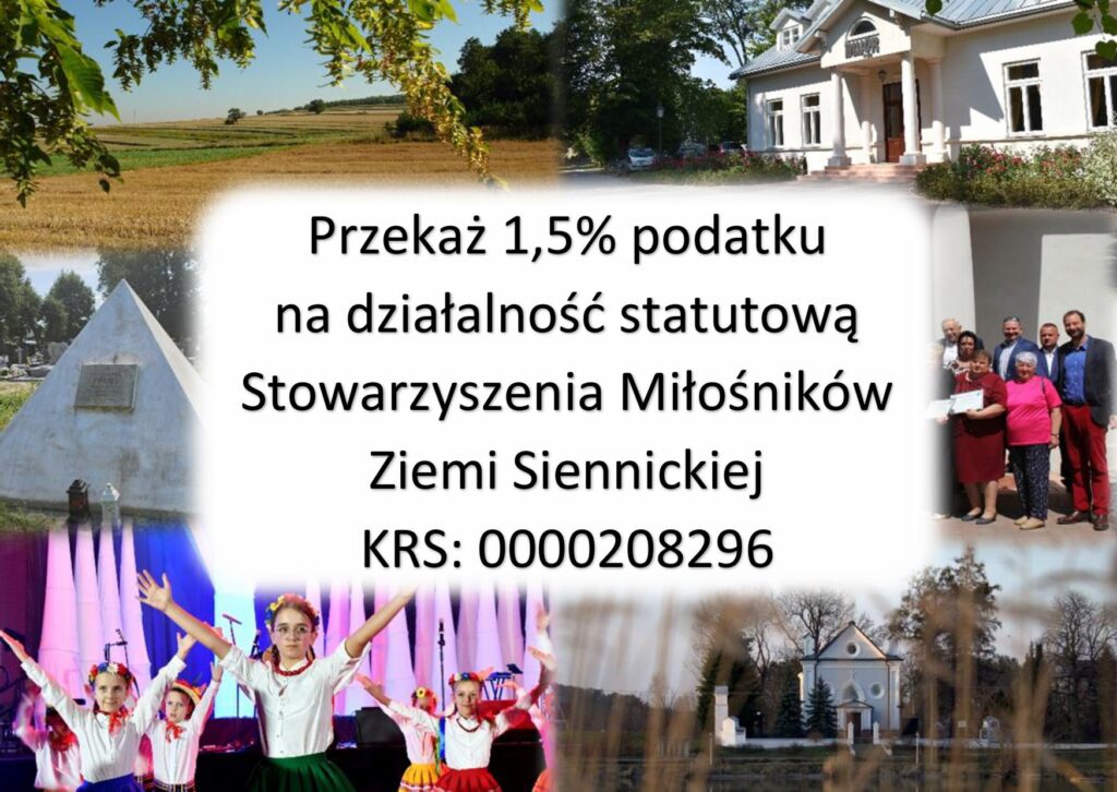 Stowarzyszenie Miłośników Ziemi Siennickiej działa nieprzerwanie od 26 maja 2004 r., a status Organizacji Pożytku Publicznego (OPP) ma od 7 lutego 2005 r. Naszą misją jest promowanie lokalnej kultury, historii, tradycji i integracja społeczności – działamy lokalnie dla dobra mieszkańców Gminy Siennica Różana. W tym roku środki chcemy przeznaczyć m.in. na: Zakup i wykonanie pomnika